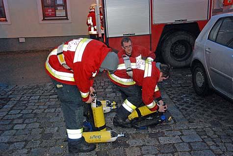 Nur kurze Zeit später rückte das erste Tanklöschfahrzeug aus. Am Einsatzort angekommen, rüstete sich ein Atemschutztrupp mit einem C-Rohr aus. Inzwischen erkundete Einsatzleiter OBI Christian Fröhlich die Lage.
