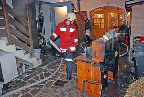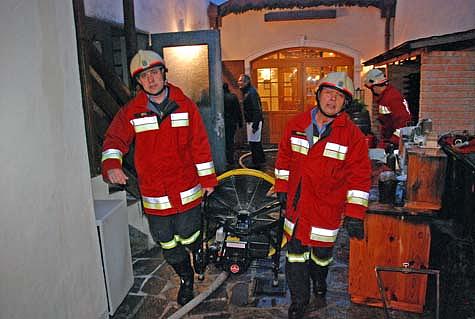 Starker Rauch drang bereits aus dem Lagerraum. Da aber der Raum nicht mit dem Lokal verbunden war, entschied OBI Fröhlich die Gäste im Heurigenlokal zu lassen, da diese sonst direkt durch den dichten Brandrauch flüchten hätten müssen.