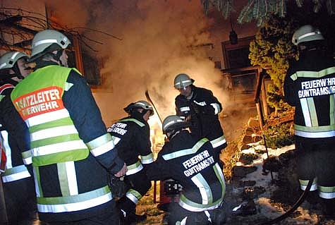 Beim Eintreffen der Feuerwehr Guntramsdorf drangen bereits dichte Rauchwolken aus dem Einfamilienhaus. Aus einem Kellerfenster schlugen Flammen bis zur Terrasse empor und setzten auch ein Holzgeländer in Brand.