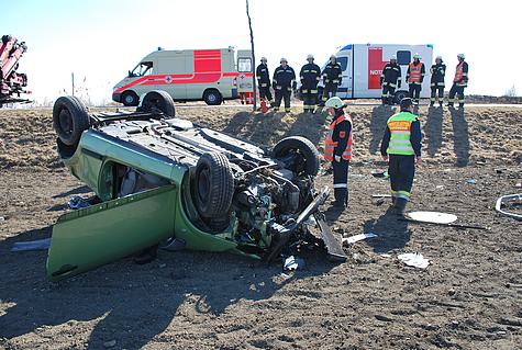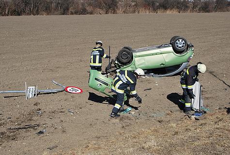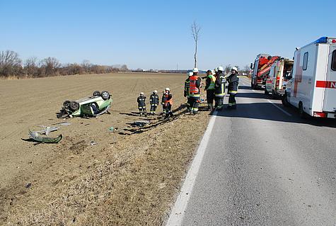 Laut Notruf hat sich ein PKW auf der Laxenburgerstraße mehrmals überschlagen und kam am Dach liegend in einem Feld zum Stillstand.