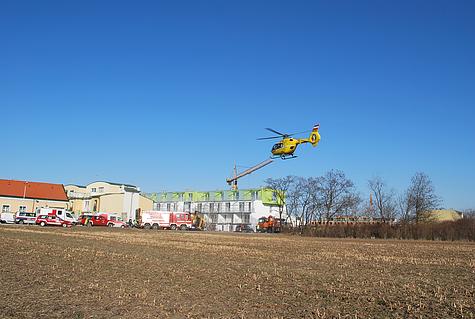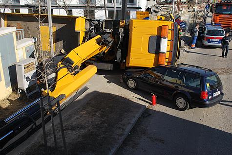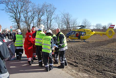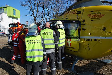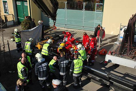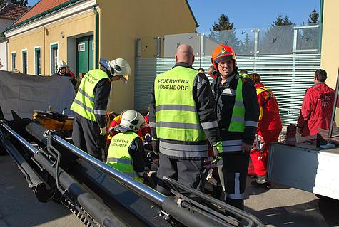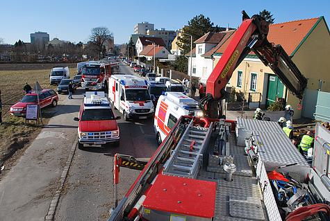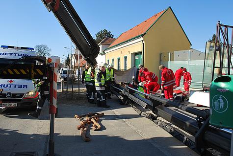 Nach dem Eintreffen der Feuerwehr Einsatzkräfte in der Ortsstraße 229 bot sich ein Bild der Verwüstung. Ein Autoladekran stürzte aus bisher ungeklärter Ursache um. Gerade zu diesem Zeitpunkt bog eine Frau mit ihrem sechsjährigen Sohn in diese Siedlungseinfahrt ein. Der LKW kam auf dem PKW der Frau zu liegen. Durch den ausgefahrenen Ladekran wurde ein Arbeiter einer Glaserei, der zufällig am Gehsteig beim nächstliegenden Haus stand getroffen und kam darunter zu liegen. Die Feuerwehr Vösendorf bereitete den Kran vom Schweren Rüstfahrzeug für das Anheben des umgestürzten Krans vor. Nach Absprache mit der Rettung wurde entschieden, den schwer verletzten 29jährigen Arbeiter händisch zu befreien. Drei anwesende Ärzte – der Vösendorfer Feuerwehrarzt Dr. Peter Berkowitsch, der sich zum Zeitpunkt der Alarmierung zufällig im Feuerwehrhaus befand, der Mödlinger Notarzt sowie die Notärztin vom Rettungshubschrauber Christopherus 9 – kämpften vor Ort um das Leben des jungen Mannes. Dieser wurde nach der Erstbehandlung durch die Unterstützung der Feuerwehr Vösendorf mit dem Rettungshubschrauber ins Krankenhaus geflogen. Die Lenkerin des PKW wurde zur Sicherheit ebenfalls ins Krankenhaus gebracht; Ihr sechsjähriger Sohn wurde von einem der anwesenden Ärzte untersucht und es konnte glücklicherweise festgestellt werden, dass er wie durch ein Wunder unverletzt blieb. Die Polizei und das Arbeitsinspektorat werden den genauen Hergang des Unfalls klären. Die Bergung des umgestürzten LKW übernimmt eine Privat-Firma. Die Feuerwehr Vösendorf stand mit 5 Fahrzeugen und 18 Feuerwehrmännern unter der Leitung von HBI Friedrich Flasar im Einsatz.Bildautor: Florian Schützenhofer, Pressestelle BFK Mödling
