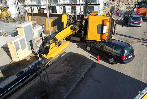 Autoladekran liegt auf PKW, ein Arbeiter vom Ausleger getroffen und schwer verletzt