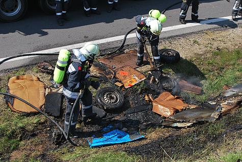 Um einen Übergriff der Flammen auf das Fahrzeug zu vermeiden, sprang der Fahrer auf die Ladefläche und warf in einer waghalsigen Aktion die brennenden Autoreifen und den Plastikmüll in den Böschungsgraben.