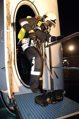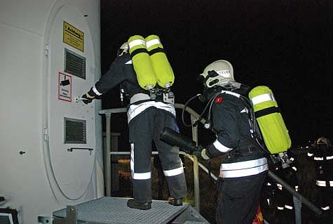 Danach begab sich ein Atemschutztrupp mit zwei CO2-Feuerlöschern in das Innere des Windrades um den Brand zu löschen. Die Löschmaßnahmen zeigten sofort ihre Wirkung und der Brand konnte binnen weniger Minuten gelöscht werden.