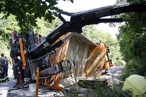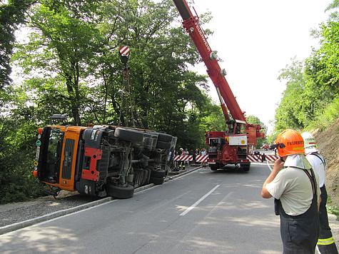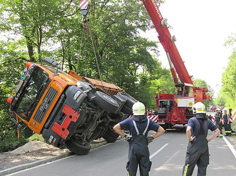 LKW mit Kran stürzt auf die Seite