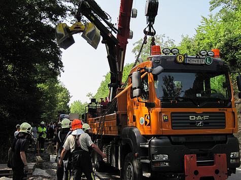 Während Bauarbeiten auf der L 128 Wöglerstraße kippte ein LKW beim Abladen eines 3000 Liter Wassertanks mittels Ladekran seitlich um.