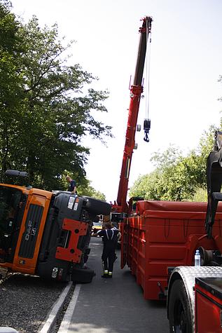 Durch die beiden Feuerwehren wurde der 18 Tonnen 2-Achs-LKW wieder auf die Räder gestellt und die Fahrbahn gereinigt.