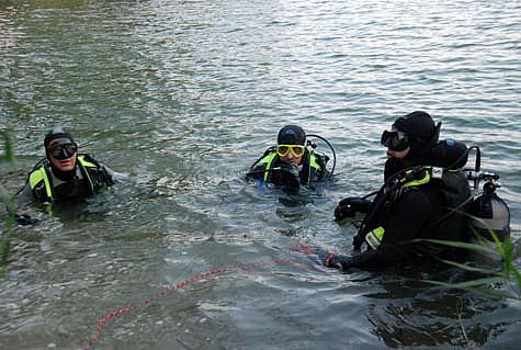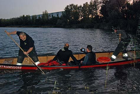 Die Tauchgruppe Süd rüstete sechs Taucher aus und begab ins Wasser. Die Sicht unter Wasser beträgt allerdings gleich Null. Die Suche gestaltete sich dadurch als sehr schwierig.