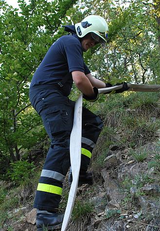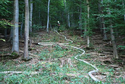 Innerhalb von 20 Minuten war die komplette Löschleitung mit einer Länge von einem Kilometer aufgebaut. Dabei mussten 140 Meter Höhenunterschied und eine Steigung von ca. 45 Grad überwunden werden.