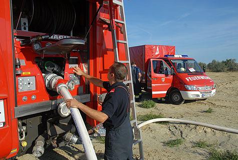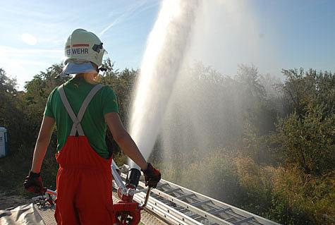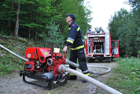 Dazu wurde mit einer Tragkraftspritze und einem Tanklöschfahrzeug Wasser angesaugt. Zwei Zubringleitungen mit insgesamt 32 B-Schläuchen versorgten damit zwei Wasserwerfer und 1 C-Rohr.