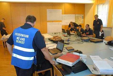 Im Führungsstab, der im Feuerwehrhaus Mödling untergebracht war, wurden alle Lagemeldungen entgegengenommen und verarbeitet. Bei der abschließenden Besprechung mit Bezirksfeuerwehrkommandant LFR Ing. Richard Feischl und Übungsbeobachter BR Anton Bernhard wurden die ersten Erkenntnisse aus der Übung aufgearbeitet: