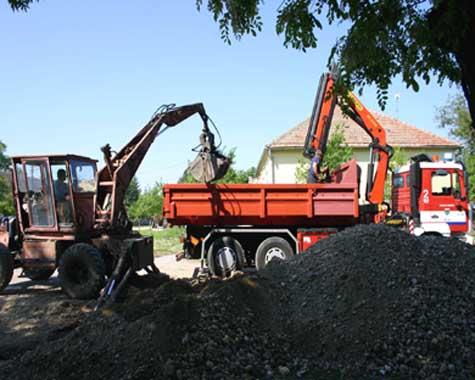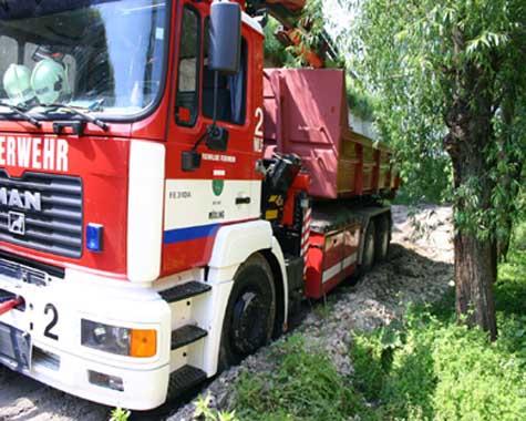 • Das Wechselladerfahrzeug Mödling mit Kran und Greifer hat den Auftrag erhalten, mit Schotter aus einer Schottergrube Wege so weit zu befestigen, dass sie von Einsatzfahrzeugen befahren werden können. Stabschef Ing. Richard Feischl: „Wir müssen uns Straßen bauen, um in den Einsatz gehen zu können!“