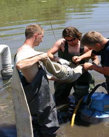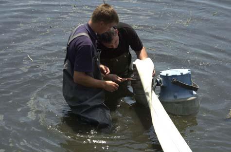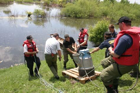 Der Einbau der Pumpen verläuft unter unvorstellbar schwierigen Bedingungen. Nur mit dem relativ leichten Wechselladerfahrzeug der Landesfeuerwehrschule Tulln kann ein aufgeweichter Damm befahren werden, und auch dies nur unter Aufbietung allen fahrerischen Könnens. Die Pumpen werden von einer Brücke aus abgeseilt und am Damm kilometerweit zur eigentlichen Einsatzstelle transportiert. Auch mit der zweiten Feuerwehrzille werden Tauchpumpen in Stellung gebracht.
