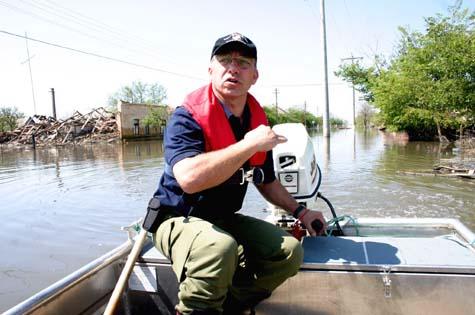 • Mit dem Boot von Deutschwagram werden Erkundungen mit örtlichen Behördenvertretern durchgeführt.