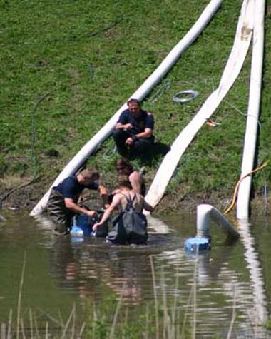 Mir einer Pumpenleistung von 2,1 Millionen Liter pro Stunde haben die österreichischen Feuerwehrkräfte den Kampf gegen die Wassermassen aufgenommen. Der Hochwassersee, dessen Pegel sie abzusenken versuchen, ist seit Wochen nahezu unverändert. Das stehende Wasser beginnt bereits zu faulen, der Verschmutzungsgrad ist unübersehbar. Pegel wurden geschlagen, um den Erfolg der Pumpaktion zu überprüfen.