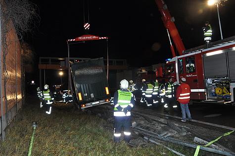 Nach Ankunft des Kranfahrzeuges Mödling konnte der Anhänger in zwei Hebevorgängen zurück auf die Fahrbahn gehoben werden. Während dieser Zeit nahm die Einsatzleitung Kontakt zum Fuhrunternehmer auf, welcher ein Ersatz-Zugfahrzeug an die Einsatzstelle entsandte.