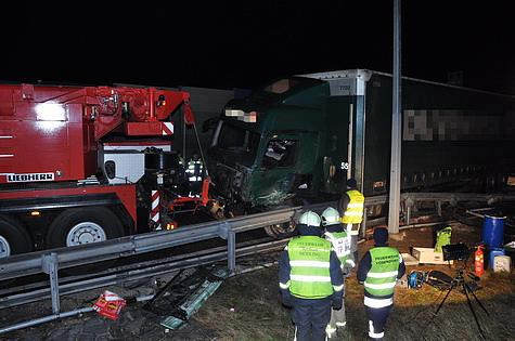 Nachdem das gesamte LKW Gespann durch das Kranfahrzeug zurück auf die Straße gezogen wurde, konnte es getrennt werden. Das beschädigte Zugfahrzeug wurde von der Feuerwehr geborgen, der Anhänger konnte mit dem Ersatz-Zugfahrzeug von der Autobahn gebracht werden.