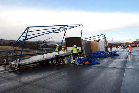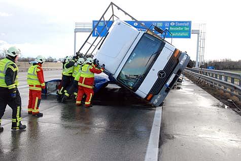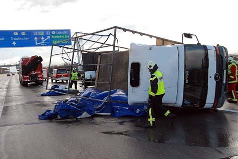 Bei der Ankunft am Unfallort lag das Zugfahrzeug gegen die Fahrtrichtung zwischen ersten und zweiten Fahrstreifen. Der Anhänger kam zum Glück auf den Rädern stehend zum Stillstand.