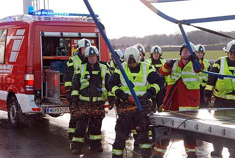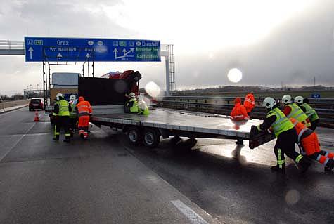 Nachdem die Polizei eine Totalsperre in beiden Fahrtrichtungen veranlasst hatte, konnte mit dem Abbau der beiden Planen begonnen werden. Unter extrem widrigen und gefährlichen Bedingungen gelang es den Einsatzkräften der Feuerwehr Wr. Neudorf diese zu demontieren.