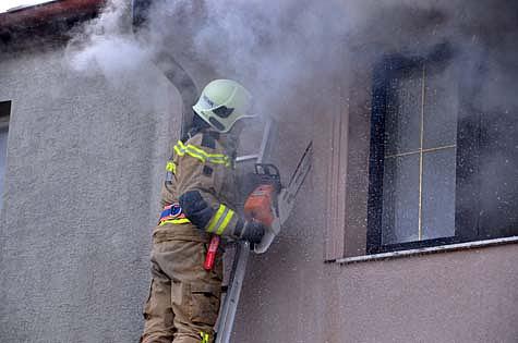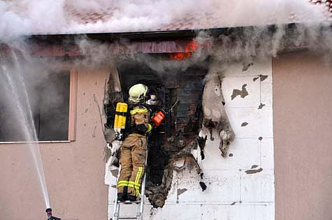 Als Erstmaßnahme wurden zwei Atemschutztrupps im Haus verteilt, um Wände und Decken des in Holzriegelbauweise errichteten Doppelhauses zu öffnen und den Brandherd zu lokalisieren.