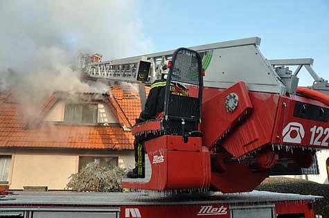 Inzwischen setzten die zwei eingesetzten Atemschutztrupps die Brandbekämpfung im Inneren des Hauses fort. Gleichzeitig wurde die Drehleiter Wiener Neudorf in Stellung gebracht, um mit einem Außenangriff im Bereich der Dachfläche beginnen zu können.