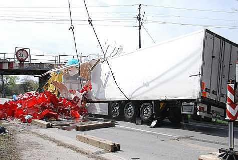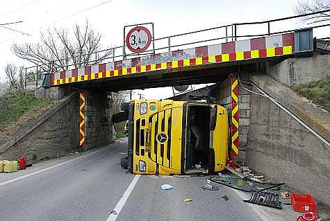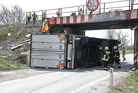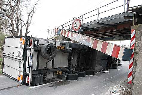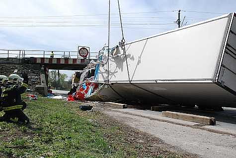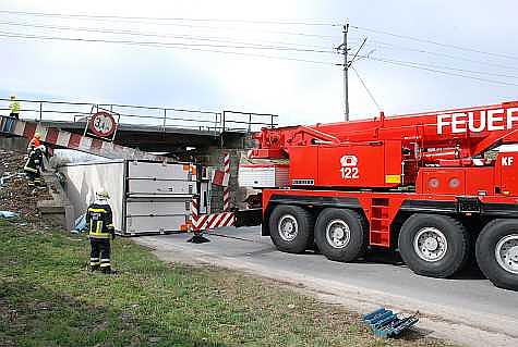 Der Lastwagen selbst lag auf der Fahrerseite - darauf eine 7t Eisenbahntraverse, die zum Schutz der Brücke dient. Diese wurde während des Umstürzens aus der Verankerung geschoben.
