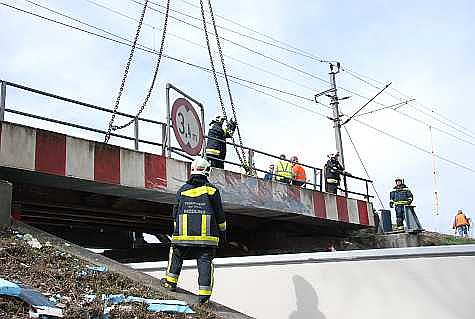 Die Eisenbahnbrücke wurde durch die Wucht des Aufpralles dermaßen verschoben und verzogen, dass der Schienenverkehr bis auf weiteres eingestellt werden musste.