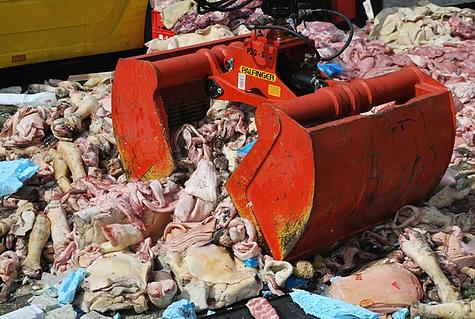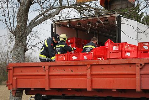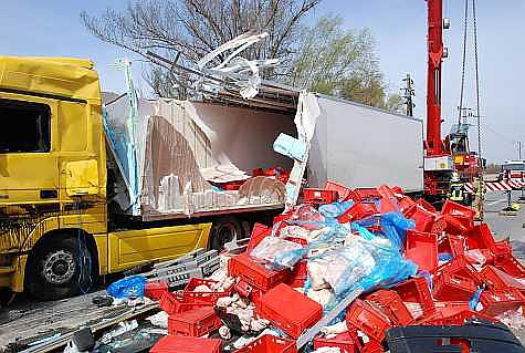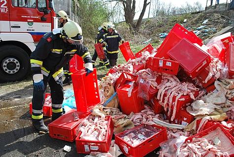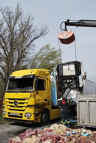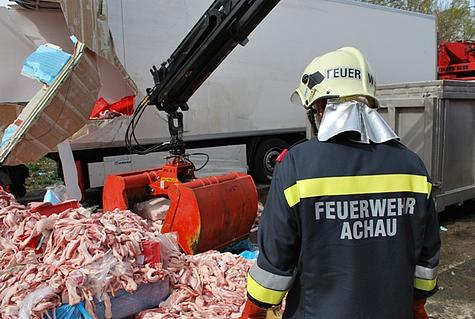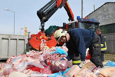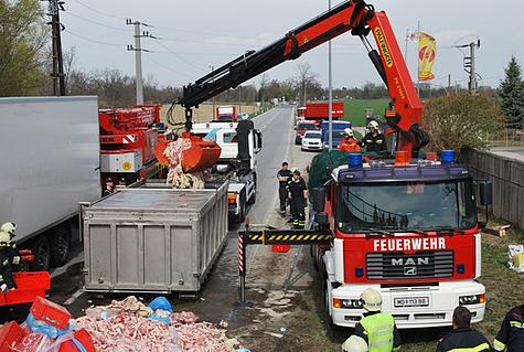Um die Straße so schnell als möglich von den Fleischteilen frei zu bekommen, wurde das Wechselladefahrzeug samt Mulde der Feuerwehr Mödling zum Einsatz nachalarmiert.