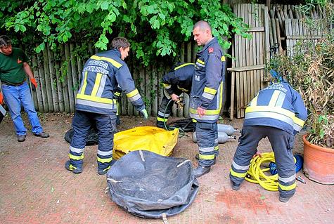 Anschließend begann die mühsame Arbeit die acht Tonnen des dampfenden Rindenmulches händisch zu entladen. Da der LKW sehr nahe an der Grundstücksgrenze lag war das Ausräumen mittels der vorhandenen Baggerfahrzeuge nicht möglich.