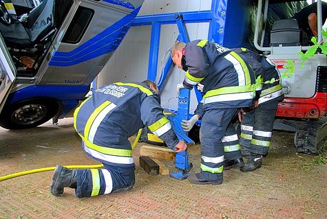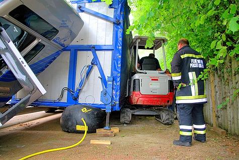 Mittels Südbahnwinde und einem großen Hebekissen sicherte die Feuerwehr den 25 Tonnen LKW, der lediglich durch die offene Fahrertüre gestützt war.