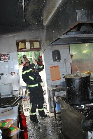 Die Lüftungsanlage wurde geöffnet und mit einem C-Rohr der Brand abgelöscht. Da unklar war, ob die Flammen auch auf den Dachstuhl übergegriffen haben, wurde ein Teil der Deckenkonstruktion geöffnet und mit der Wärmebildkamera auf Glutnester untersucht.
