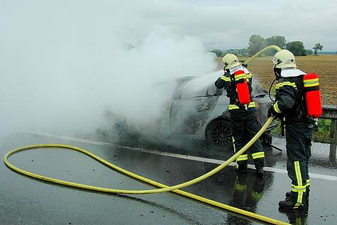 Sofort wurde der brennende PKW mit einem Rohr unter Atemschutz gelöscht und parallel mit einem zweiten Rohr der Flurbrand auf der Böschung bekämpft.
