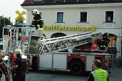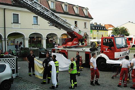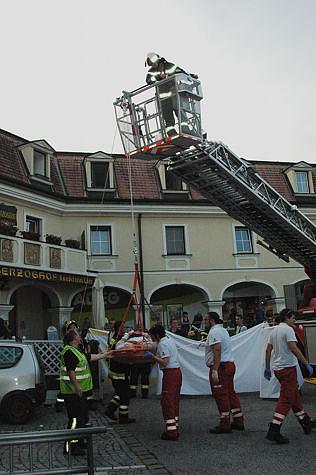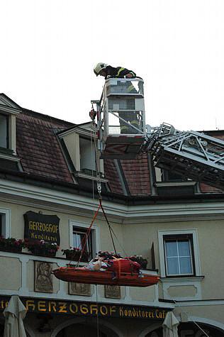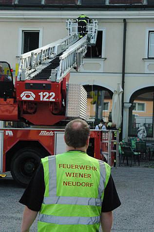 Am 28. Juli wurde die Freiwillige Feuerwehr Laxenburg zur Assistenzleistung für das Rote Kreuz gerufen. Zeitgleich wurde auch die FF Wiener Neudorf mit der Drehleiter alarmiert. In der Herzog Albrecht Strasse in Laxenburg musste eine Frau aus dem 1. Stock durch das Rote Kreuz in Krankenhaus gebracht werden. Allerdings stand in dem Haus kein Aufzug zur Verfügung und ein Abtransport der übergewichtigen Frau durch das enge Stiegenhaus war nicht möglich.