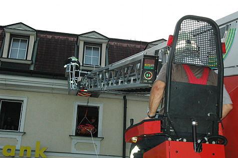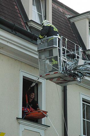 Anschließend konnte die Rettung durch das Fenster der Wohnung im 1. Stock beginnen. Das Hauptaugenmerk lag dabei auf der kontrollierten Umsetzung von der Auflage auf der Fensterbank zum freihängenden Zustand an der Drehleiter.