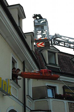 Die beiden Teams in der Wohnung und an der Drehleiter leisteten perfekte Zusammenarbeit und konnten wenig später die Frau am Boden absetzen. In einem Sichtschutzbereich wurde die Patientin anschließend auf die Trage der Rettung umgeladen und für den Abtransport bereit gemacht.