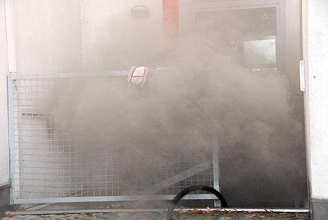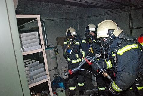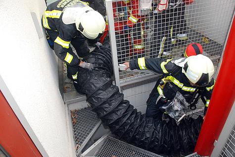 Sofort begab sich ein Atemschutztrupp mit einem HD-Rohr zum Kellerabgang. Dort drangen bereits Rauchschwaden empor. Um eine Verrauchung der anderen Räume zu vermeiden, wurden sämtliche Türen und Fenster der Wohnhausanlage geschlossen.