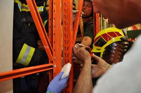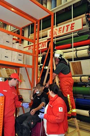 Nach Stabilisierung des Verletzten und nach Rücksprache mit dem Notarzt wurde das Hochregal mit einer Nussratsche behutsam geöffnet. Binnen wenigen Augenblicken konnte so der Mann aus seiner misslichen Lage befreit werden.