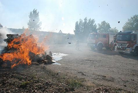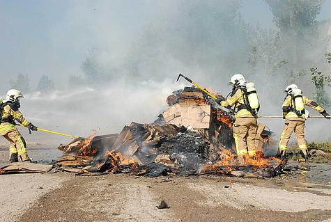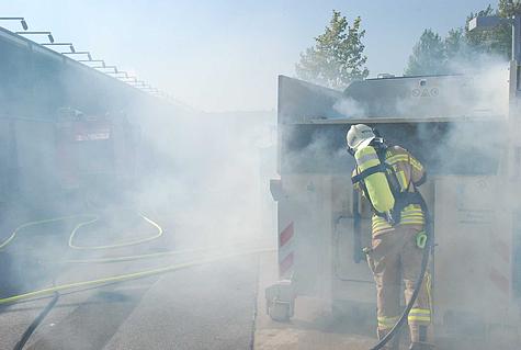 Bei der Ankunft in der Autoallee drangen bereits dichte Rauchschwaden aus dem Presscontainer. Sofort wurde unter Atemschutz ein C-Rohr zur Brandbekämpfung in Stellung gebracht. Die Wasserversorgung wurde über einen Hydranten sichergestellt.