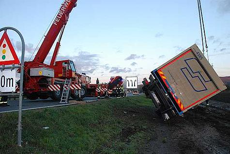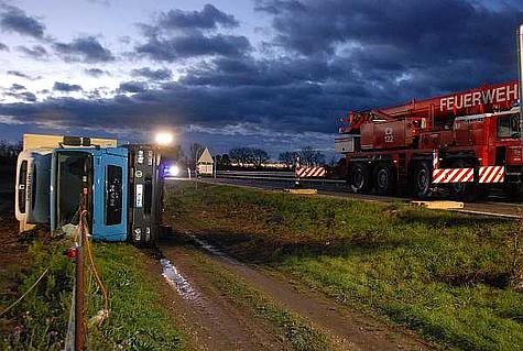 Der Lenker des 16,6 t Lastwagens kam von der Straße ab, geriet ins Bankett und stürzte anschließend in den Graben. Der LKW kam seitlich auf der Beifahrerseite zum Liegen. Die verletzte Person wurde vom Roten Kreuz versorgt.