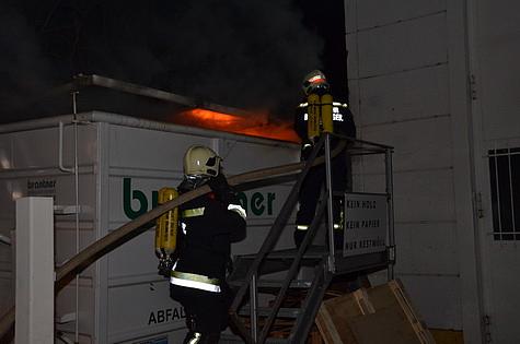 Bei Ankunft der Feuerwehr an der Einsatzstelle konnte starker Rauchaustritt aus einem direkt an ein Gebäude angrenzenden Abfallcontainer festgestellt werden. Sofort wurde ein Löschangriff mit zwei C – Rohren aufgebaut um ein Übergreifen des Brandes auf die Firmenhalle zu verhindern.