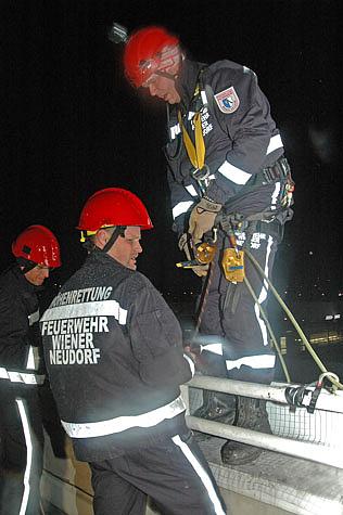 Da diese in einer Höhe von 26 Metern waren und für Hubrettungsfahrzeuge keine Aufstellmöglichkeit bestand, entschloss sich die Einsatzleitung Vösendorf, die Höhenrettungsgruppe Wiener Neudorf zu alarmieren.