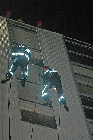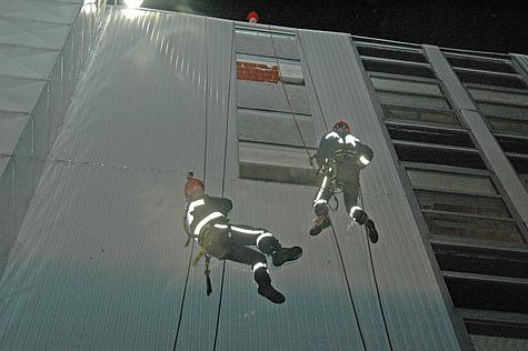 Anschließend seilten sich zwei Höhenretter ab und begannen mittels Bohrmaschinen in schwindelerregender Höhe die losen Blechteile zu sichern.
