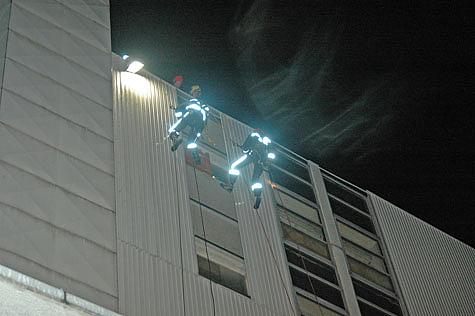 Über die Dachterrasse im 6. Stock des Gebäudes bauten die Höhenretter eine redundante Sicherung auf. Die Wetterverhältnisse waren zu diesem Zeitpunkt äußerst widrig. Der Einsatz war durch starke Sturmböen sowie intensiven Regen besonders schwierig.