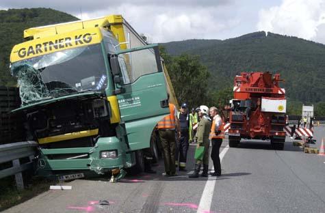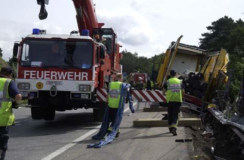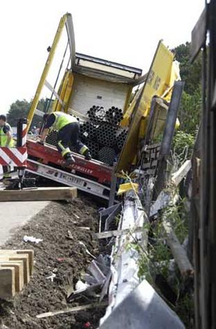Nach einem Verkehrsunfall drohte auf der Außenringautobahn A 21 bei Alland ein mit 24 Tonnen Stahlrohren beladener Sattelschlepper umzustürzen. Das tonnenschwere Fahrzeug hing in einer Linkskurve schräg an der Leitschiene und Lärmschutzwand. Die Freiwillige Feuerwehr der Stadt Mödling war mit dem Kranfahrzeug angefordert worden und sicherte gemeinsam mit der Feuerwehr Alland das Fahrzeug. Zunächst mussten mit dem Kran die Stahlrohre von der Ladefläche gehoben werden, was aufgrund der verrutschten Ladung sehr kompliziert war und mehrere Stunden in Anspruch nahm. Erst danach war eine Bergung des Fahrzeuges möglich. Die Autobahn war zunächst längere Zeit gesperrt, dann konnte der Verkehr einspurig an der Einsatzstelle vorbei geleitet werden.Bildautor: Gottfried Bauer/Pressestelle BFK Mödling