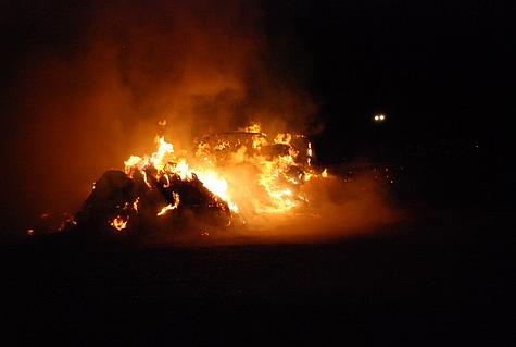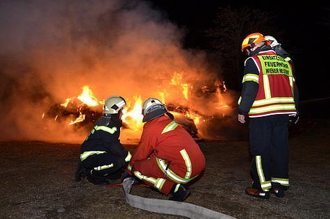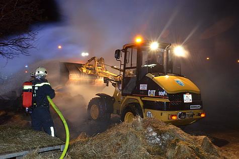 Nach Erkundung der Lage entschied sich der Einsatzleiter HBI Walter Wistermayer, das bereits in Vollbrand stehende Stroh zu verteilen, und kontrolliert abbrennen zu lassen.