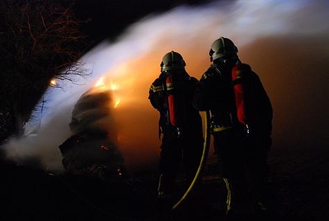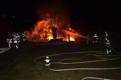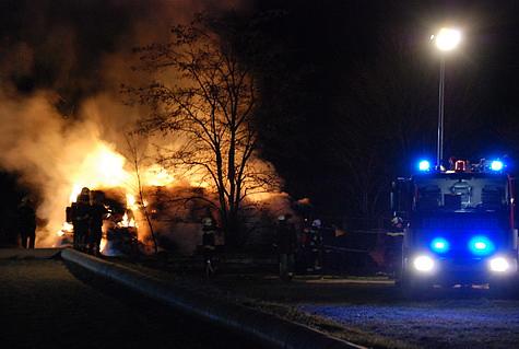 Bereits um 00:14 Uhr konnte bis auf wenige Glutnester der Brand als gelöscht gemeldet werden.