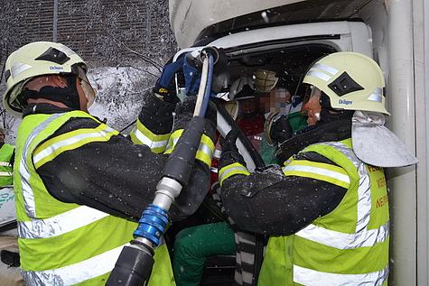 Nach Stabilisierung des Verletzten konnte die Feuerwehr mit der Rettung des Fahrers beginnen. Mit Hilfe der hydraulischen Rettungsgeräte konnte im ersten Schritt die verkeilte Türe entfernt werden. Im nächsten Schritt wurde mit Hilfe eines hydraulischen Zylinders der gesamte Vorbau des Klein- LKW zurück gedrückt und somit konnte der eingeklemmte Fahrer befreit werden.