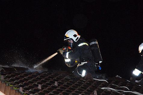 Sofort wurde eine dreiteilige Schiebleiter und ein C-Rohr in Stellung gebracht. Anschließend konnte ein Atemschutztrupp auf das Dach steigen und erste Maßnahmen setzen. Gesichert wurden die Einsatzkräfte über den Steig Brunn.