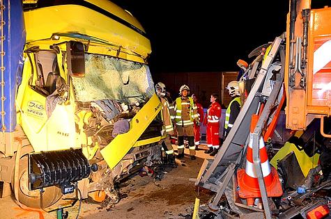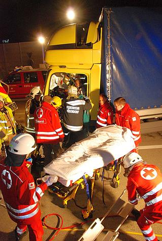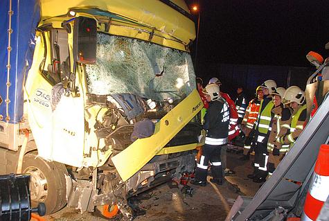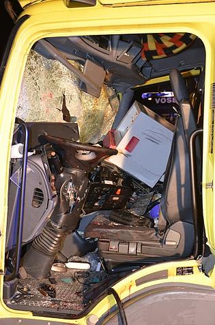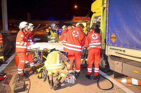 Durch die Wucht des Aufpralles wurde der 48-jährige ungarische Lenker im Führerhaus vom Becken abwärts eingeklemmt. Mittels hydraulischem Rettungsgerät wurde zuerst die Fahrertüre entfernt.
