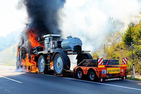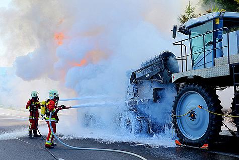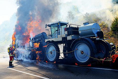 Bereits bei der Anfahrt konnte eine riesige Rauchsäule wahrgenommen werden. Beim Eintreffen der Feuerwehr Gießhübl an der Einsatzstelle standen die Zugmaschine sowie Teile des Anhängers inklusive der darauf befindlichen landwirtschaftlichen Maschine (Maisgebläsetester) in Vollbrand. Der 46jährige Lenker konnte sich rechtzeitig in Sicherheit bringen. Auch griff der Brand bereits auf Teile der trockenen Böschung über.